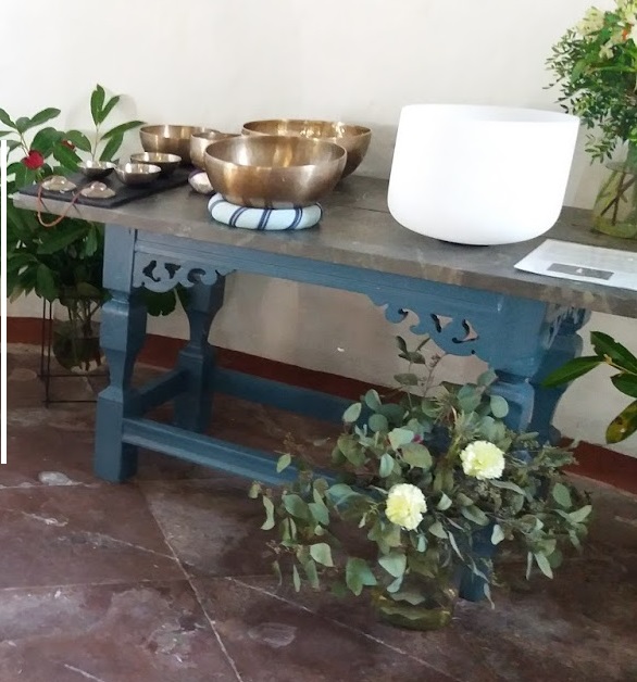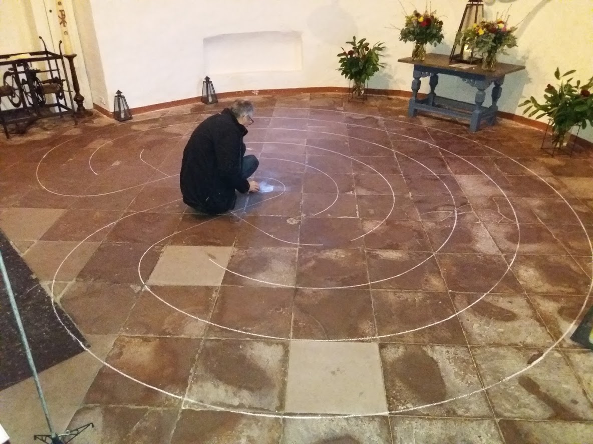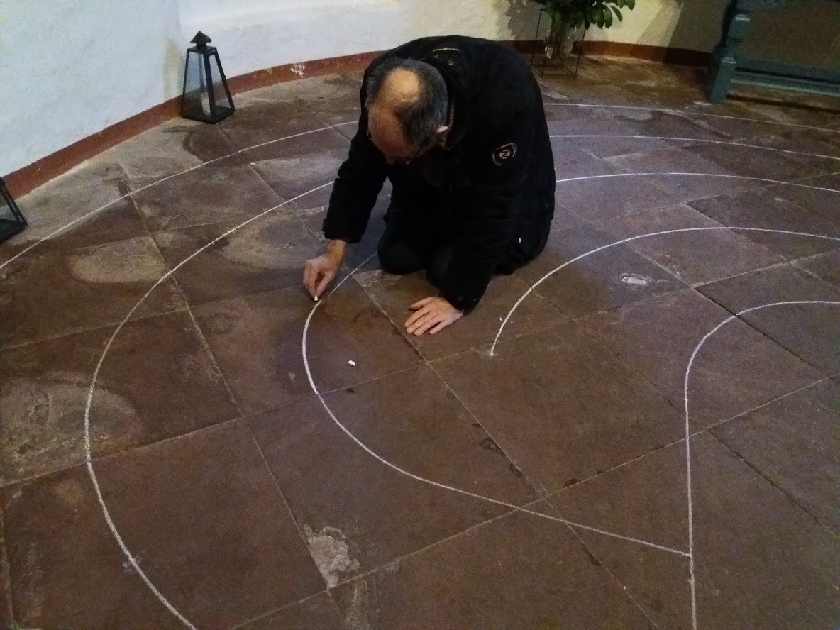 Het uittekenen van een Labyrint met krijt, rechts het lopen van het labyrint, met voorafgaand een Klankmeditatie.